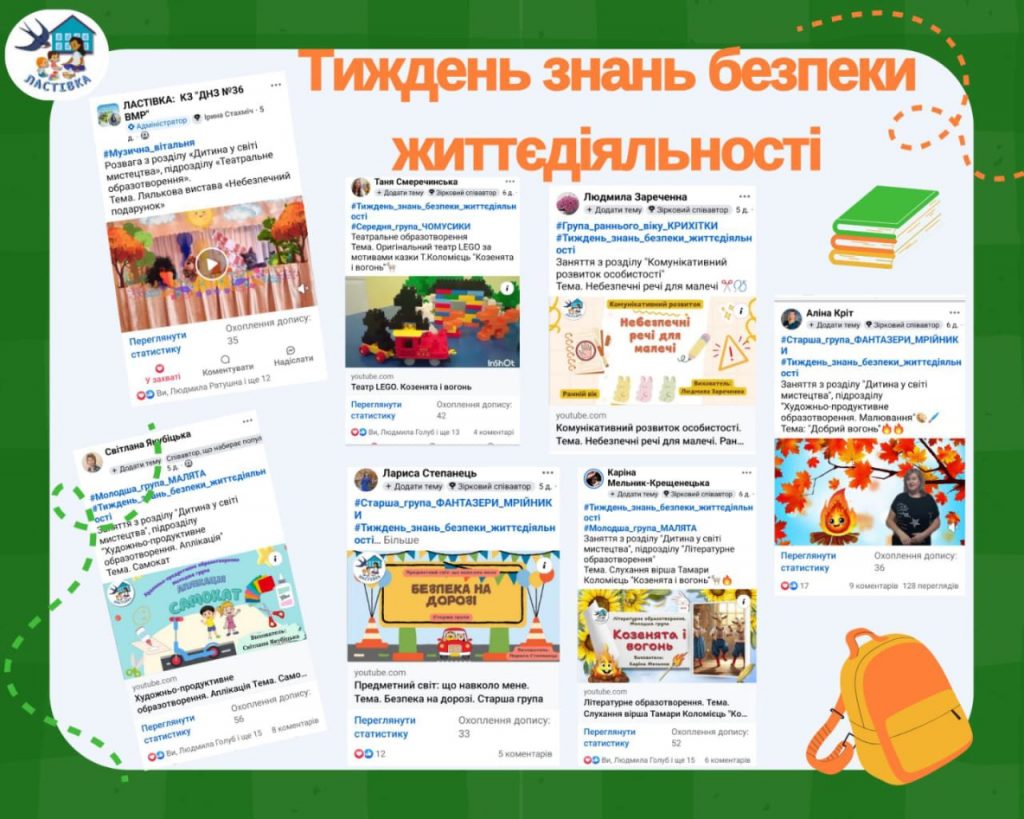 В період з 10.11.2025 по 14.11.2025 відповідно до наказу департаменту освіти Вінницької міської ради від 04.11.2025 № 486 «Про проведення Тижня знань безпеки життєдіяльності в закладах дошкільної освіти», з метою удосконалення організаційної та практичної роботи з питань безпеки дитини в закладі дошкільної освіти, свідомого та дбайливого ставлення дітей до свого здоров’я, підняття рівня інформаційно-просвітницької роботи з питань забезпечення безпечної життєдіяльності учасників освітнього процесу, в комунальному закладі «Дошкільний навчальний заклад № 36 Вінницької міської ради» проведені заходи тижневика.